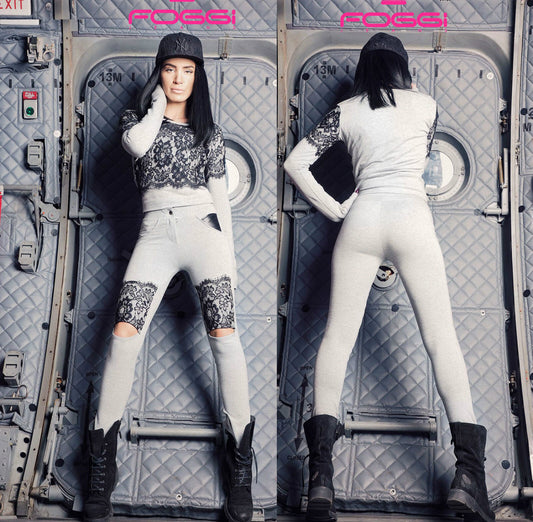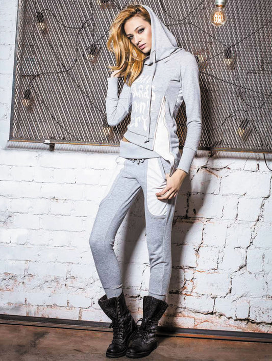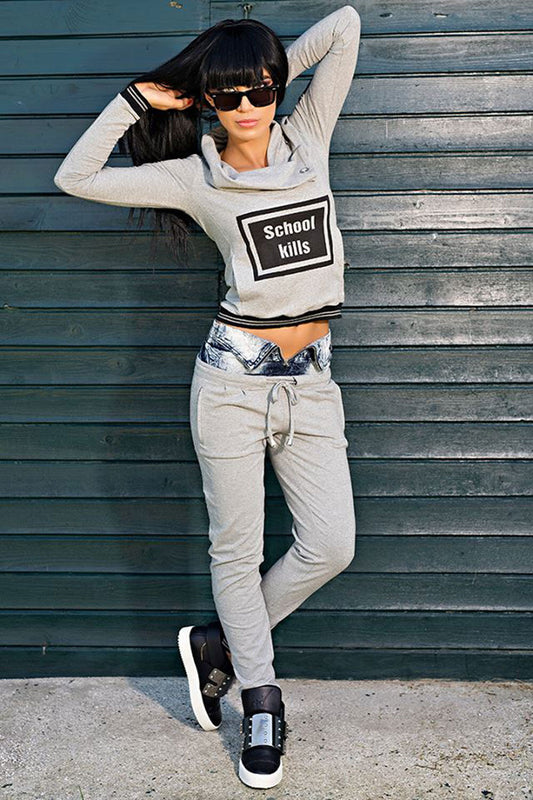 Foggi Damen 2-Teiler Jeans Jogginganzug Pullover Freizeitanzug Grau Schwarz S 36