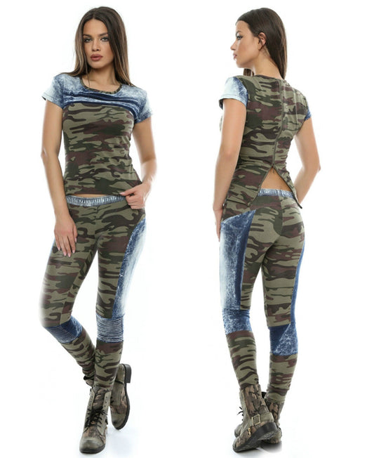 Foggi Damen 2-Teiler Jeans T-Shirt Camouflage Röhrenhose Jeanshose set XS 34