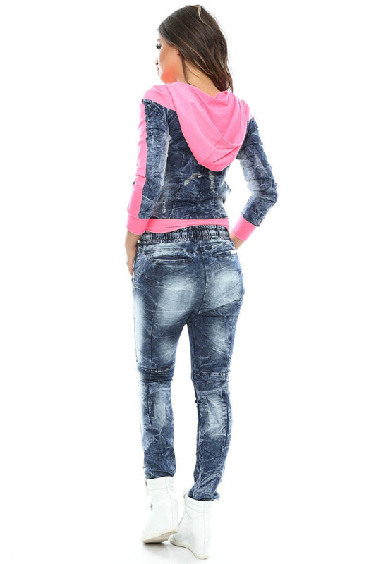 Foggi Damen 2-Teiler Jeansjacke Hüftjeans Boyfriedjeans Kapuzenjacke Pink XS 34