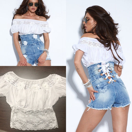 Mexton Damen Bluse Spitzenbluse Cropped-Top Weiß