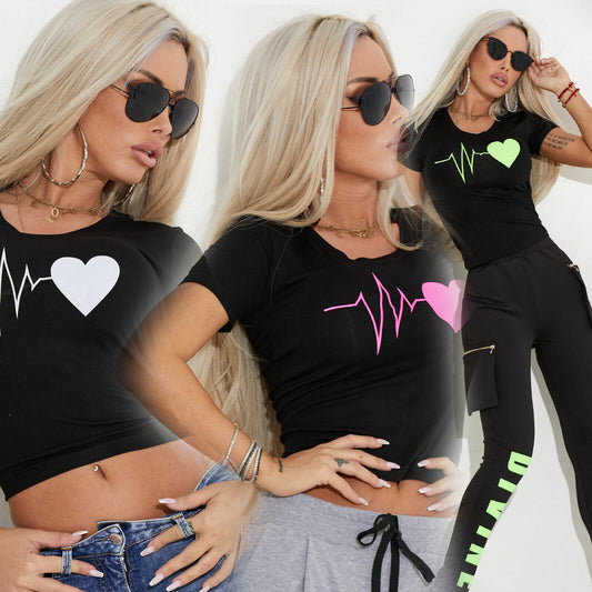 By Alina Mexton Damen T-Shirt Bluse Kurzarm Print Herz Neon Rosa Grün M