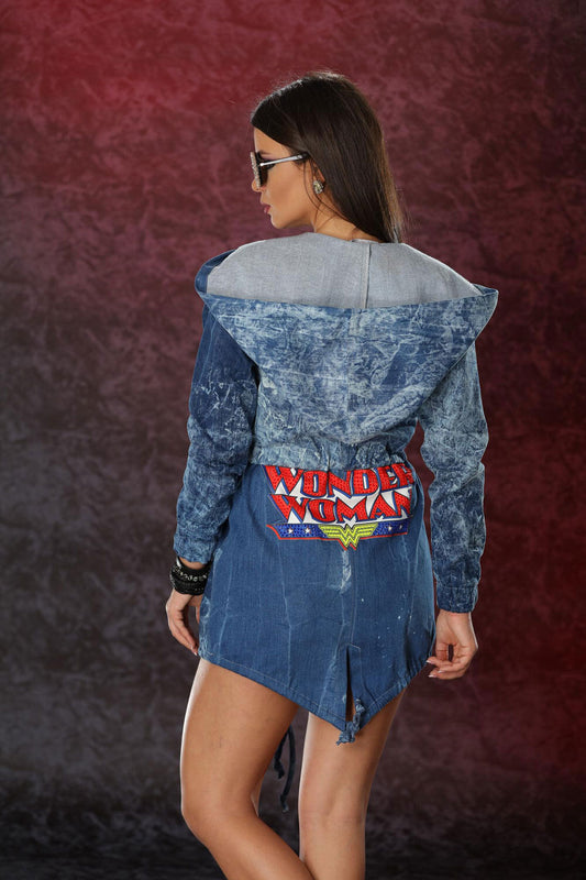 Ocassion Damen Jeansjacke Felljacke Kurzjacke Bauchfrei Kapuzenjacke Blau 32 XXS