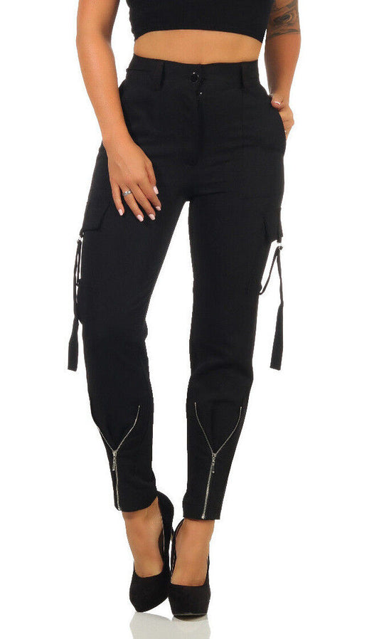 Damen Hose High-Waist Stoffhose Cargohose Röhrenhose Elegant Zipper XS-L