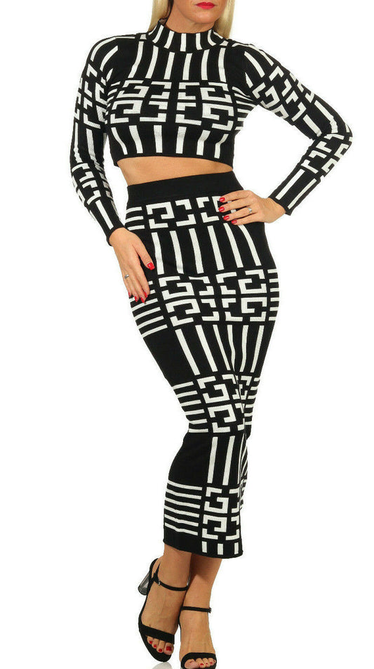 Damen 2-Teiler Strick Top bauchfrei + High-Waist Midirock Strickkleid Set