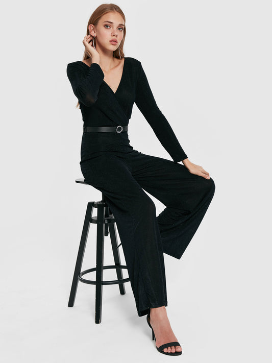 Damen Overall Jumpsuit High-Waist Hosenanzug Glitzer Einteiler Transparent S-L