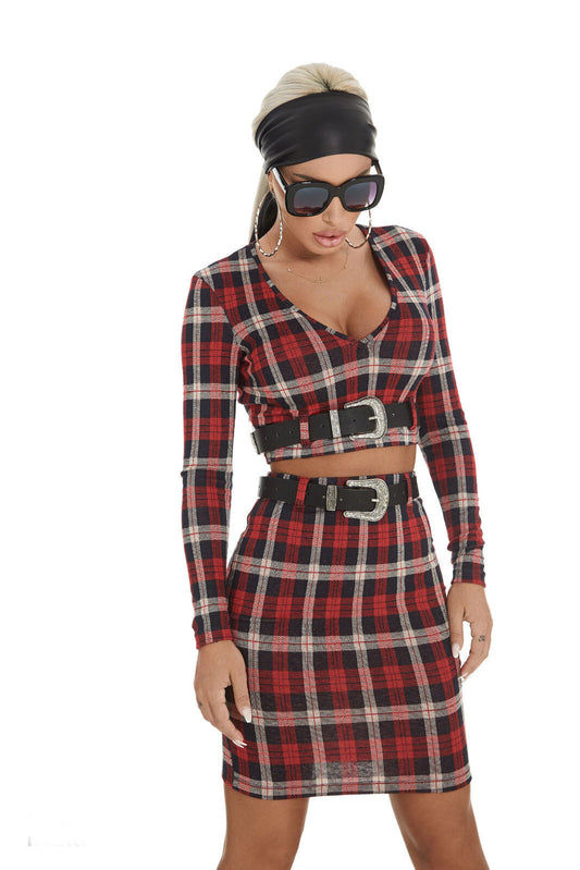 By Alina Mexton Damen 2-Teiler Cropped Pullover Top + Minirock Kariert Rot XS S