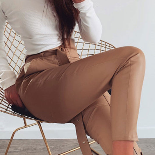 LA Damen Hose High-Waist Röhrenhose Paperbag Lederlook Pants Business Beige S M