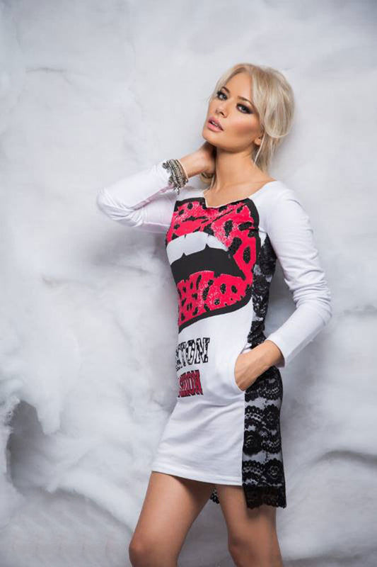 Mexton Damen Kleid Longpullover Spitze Minikleid Kussmund Tunika XS S