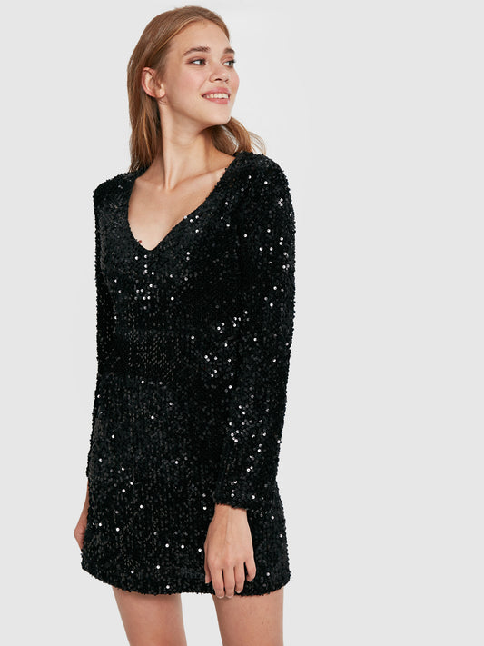 Damen Pailletten Kleid kurz Cockteilkleid Partykleid Sequin Tunika Schwarz S M