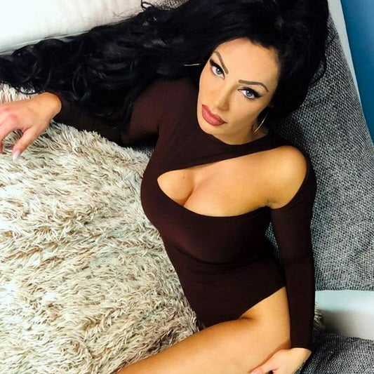 LA Damen Body langarm Bodysuit Bodie T-Shirt Cut-Out Pulli Bluse Braun XS-M