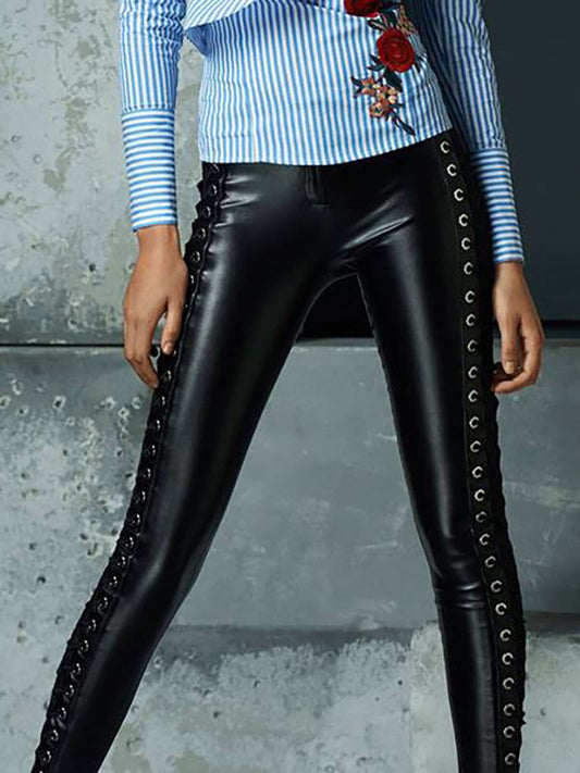 Mexton Damen Röhrenhose Schnürung Sexy Bikerhose Hüfthose Lederlook XS-S