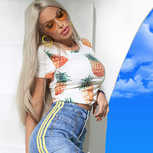 By Alina Mexton Oberteil Bluse T-Shirt Tunika Kurzarm Shirt Obst Print Ananas