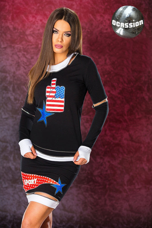 Ocassion Damen 2-Teiler Pullover + High-Waist Minirock Rock USA Print XS